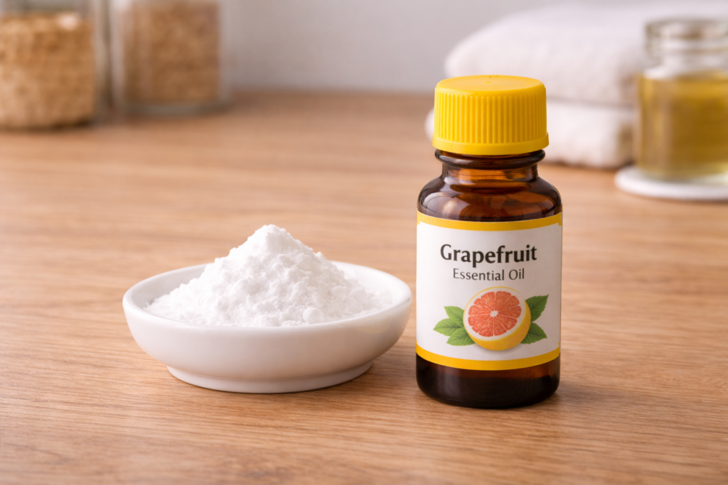 重曹と精油を混ぜるだけで、手軽に「香るクレンザー」が作れます。材料は重曹100gと、お好みの精油5〜10滴だけです。